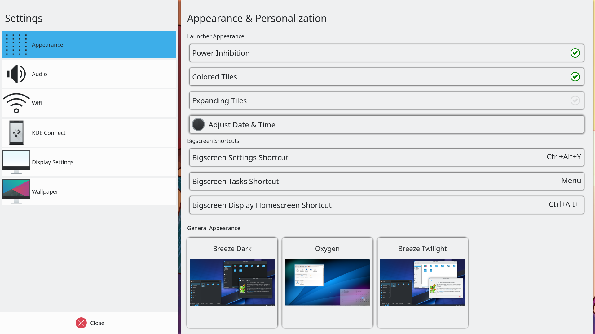 Plasma Bigscreen is a Plasma-based shell (desktop environment) for TVs and other large displays. It is designed to be used with arrow navigation using remotes or controllers.