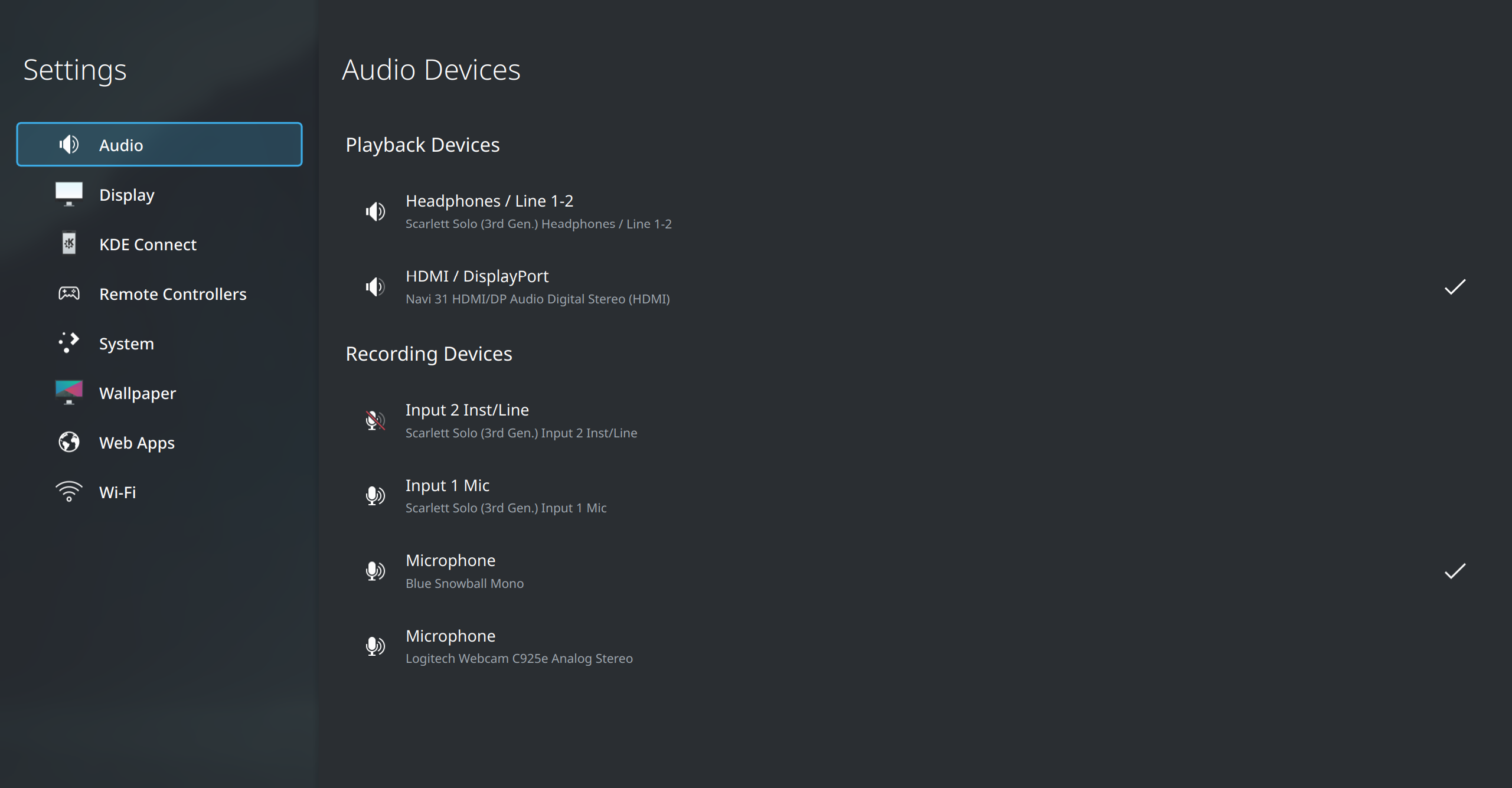 The settings modules (KCMs) had a lot of hardcoded UI elements and layouts. I decided to make a small component library to build TV focused UIs (that still look Breeze like), and ported all of the settings modules to it. I moved away from horizontal layouts to vertical layouts for content, and put a heavier emphasis on sidebars for interacting with individual delegates. I think it looks pretty nice: